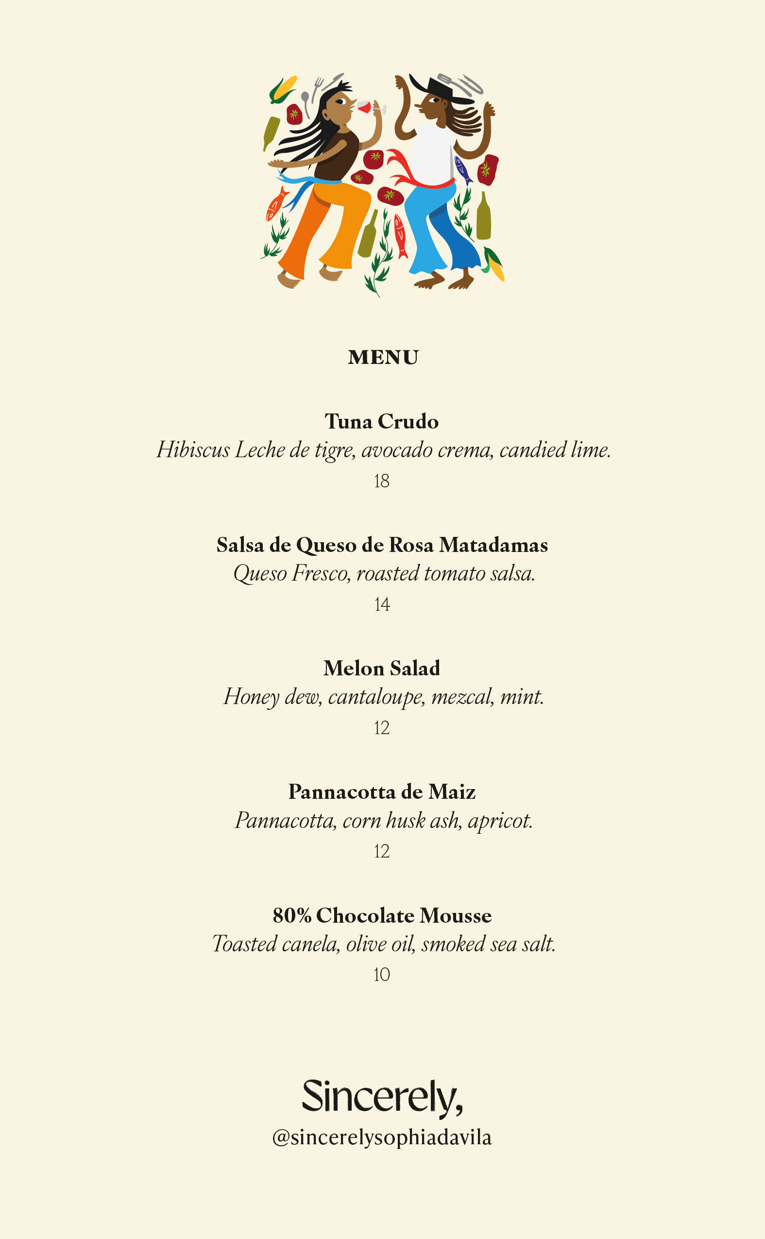 More than simply promoting an event, the identity needed to translate a deeply personal culinary experience and appreciation into a visual language—one that reflected warmth, vibrancy, and the cultural influence on Sophia. The final system included custom illustrations, promotional assets for socials, and a printed menu, all designed to work together as a cohesive experience that extended the story of the food beyond the plate.